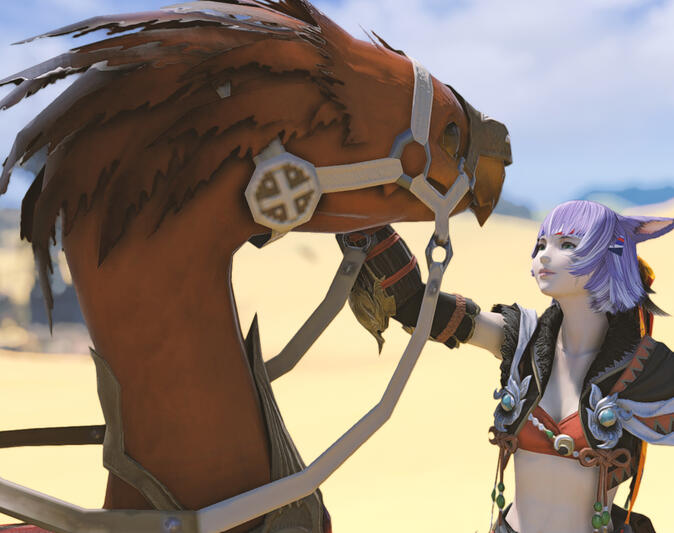 Her ever-faithful chocolate covered chocobo! They first met in Ul'dah, around the time Aera had first came to Eorzea, where no one was willing to buy the bird for being unable to fly due to a charred wing and also being aggressive towards most people. But when Aera saw him, she instantly felt a connection. She scrapped up what gil she could and was able to get him! Now, they are quite close.